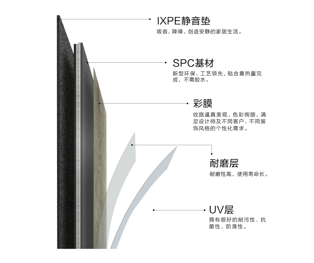 SPC防水防滑环保石塑地板,采用新型环保材料,耐磨耐污,抗菌防滑,纹理清晰美观,满足设计师及客户的个性化需求,深受国内外消费者推崇。