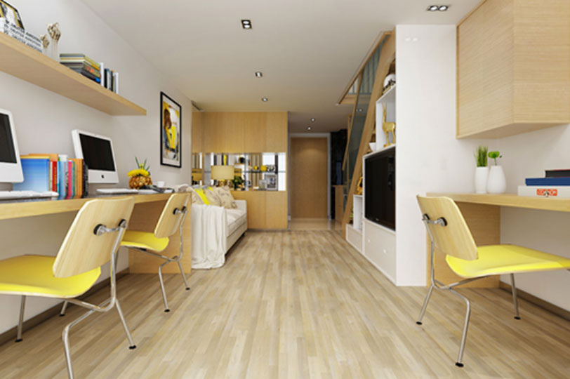 一般小户型选择浅色系的地板,这样可以显得空间更大,因浅色系与墙面、地面等颜色接近,起到可模糊每个界面的作用,给人以空间更宽阔的感觉;